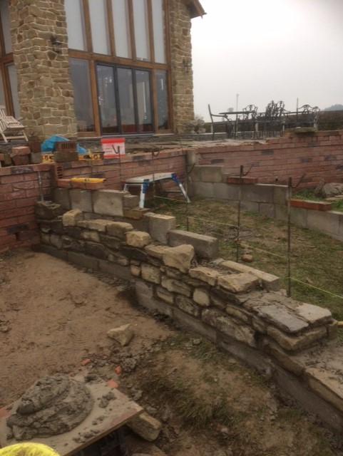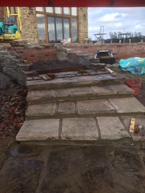 Challenge: Landscaping works carried out near Dorrington, Shropshire in conjunction with our specialist landscaper. Using natural stone slabs and hand made bricks for walls and edgings.