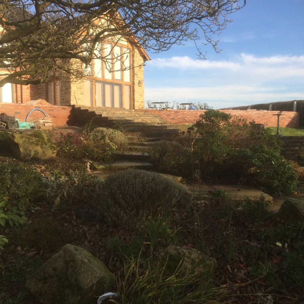 Challenge: Our challenge in January 2019, was to create a staircase to enable access from the patio level to join up with an existing stone pathway on the lower garden level. Our landscape specialist worked with us again on this landscaping project at Percy Throwers old residence.